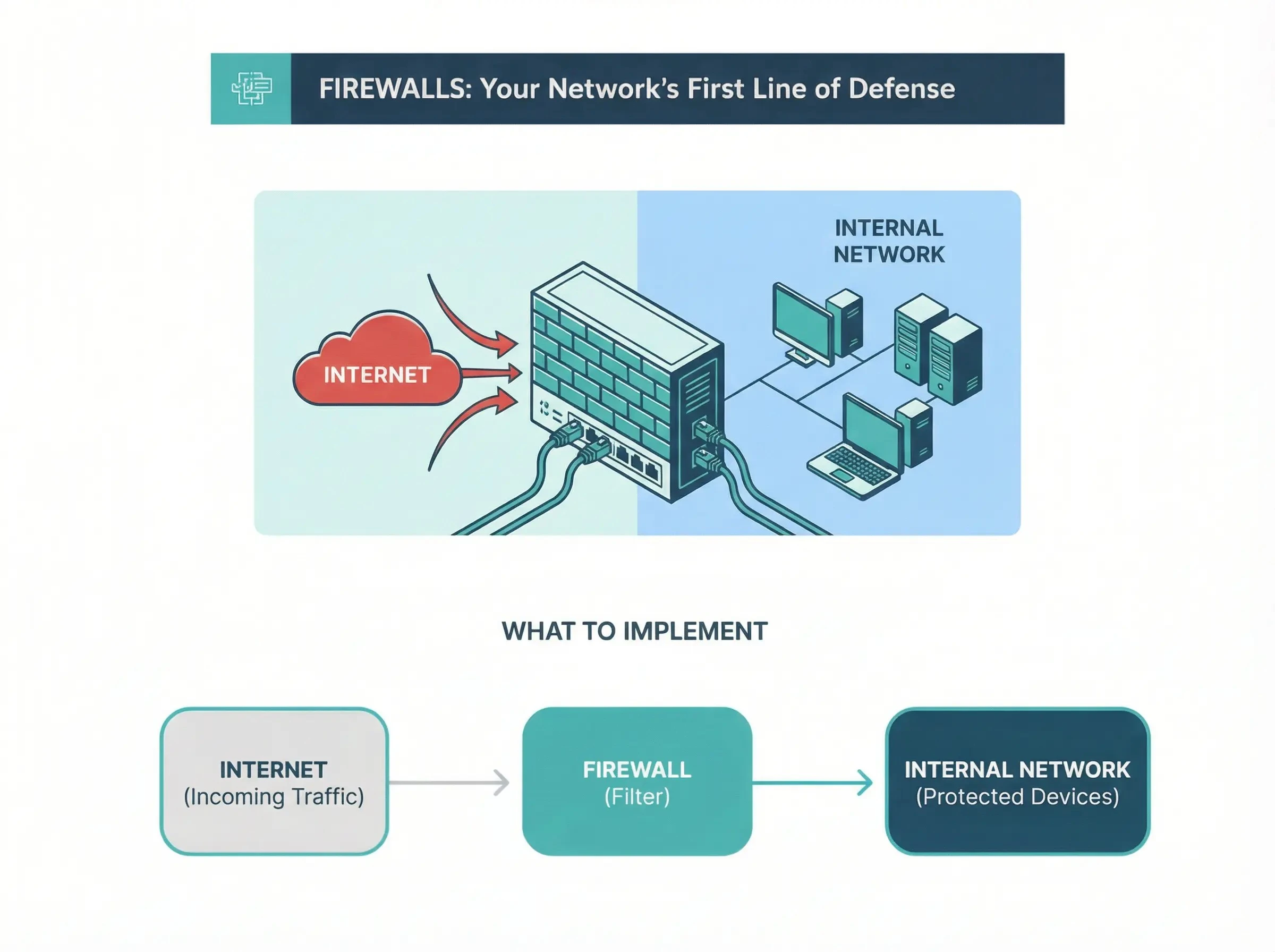 Like a security guard at your office door, firewalls act as a barrier between your company network and the internet, controlling what data goes in and out to prevent unauthorised access.